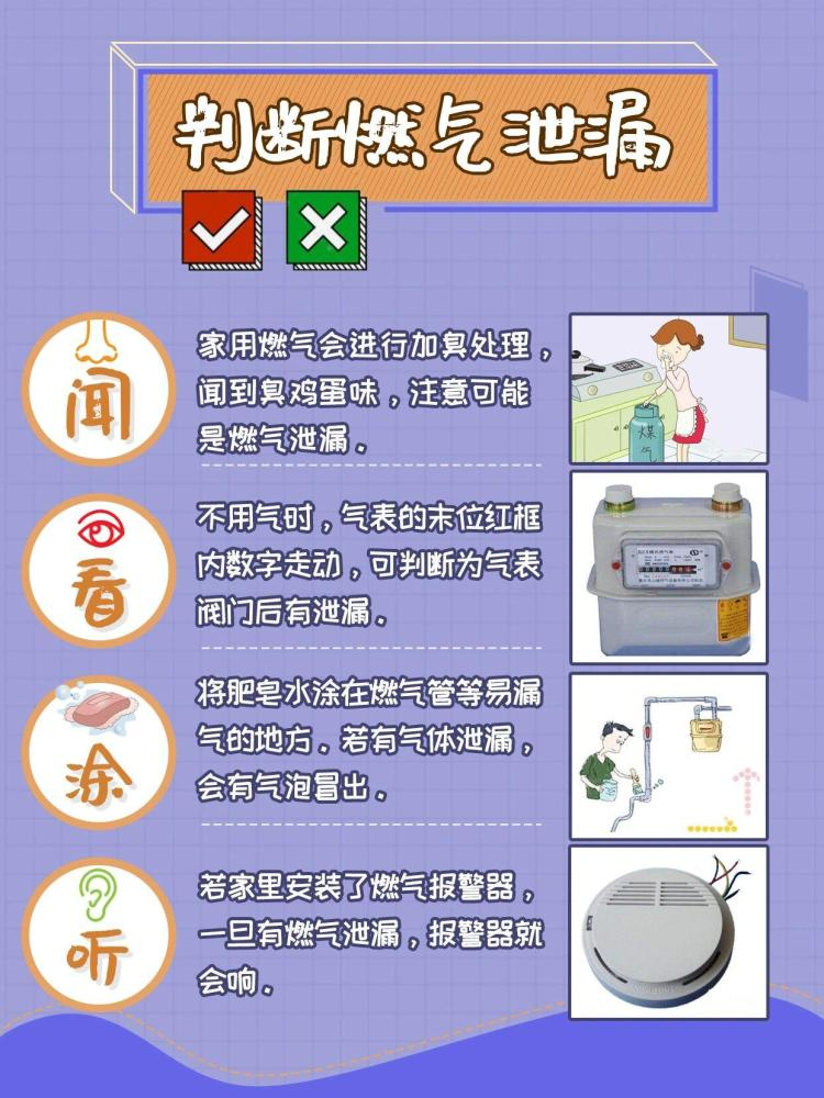 要牢记口诀“一抹二听三闻四观”,如果用肥皂水(或洗涤剂水)涂抹燃气表、阀门及管道连接处有气泡产生;在家中听到轻微的“呲呲”声;闻到家中有臭味;或是在确认不使用燃气的情况下观察燃气表,表内数字发生变化,都有可能是发生了燃气泄漏。发现异常要及时关闭燃气阀门,并联系专业人员进行维修、更换,千万不要自行触动电器开关,或使用打火机等明火进行燃气泄漏检查。