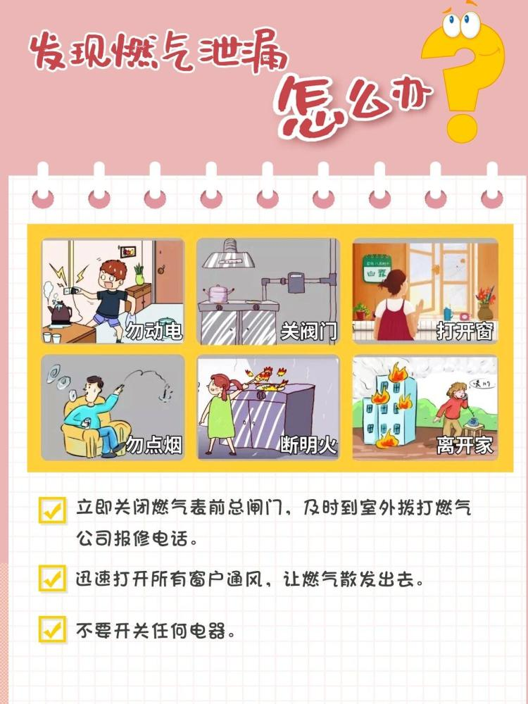 需要注意的是,如果发现邻居家有漏气情况,不要按动邻居的门铃,以避免静电、火花的产生。要轻轻敲门,提示正确处置漏气事项。