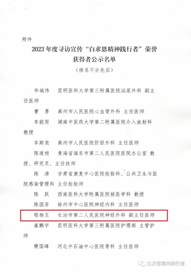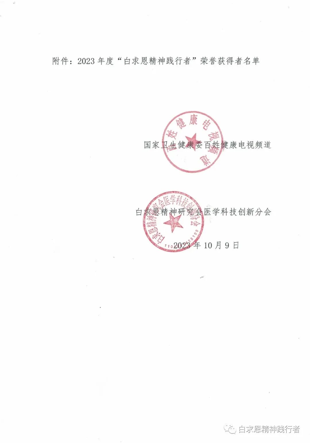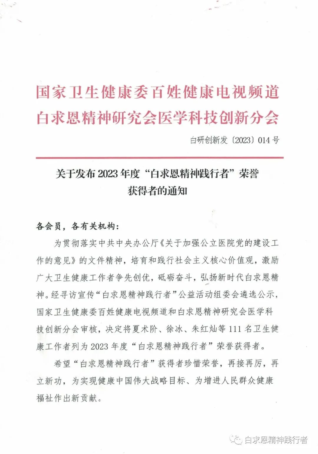 为贯彻落实中共中央办公厅《关于加强公立医院党的建设工作的意见》的文件精神,培育和践行社会主义核心价值观,激励广大卫生健康工作者争先创优,砥砺奋斗,弘扬新时代白求恩精神。经寻访宣传“白求恩精神践行者”公益活动组委会遴选公示,国家卫生健康委百姓健康电视频道和白求恩精神研究会医学科技创新分会审核,决定将夏术阶、徐冰、朱红灿等111名卫生健康工作者列为2023年度“白求恩精神践行者”荣誉获得者。