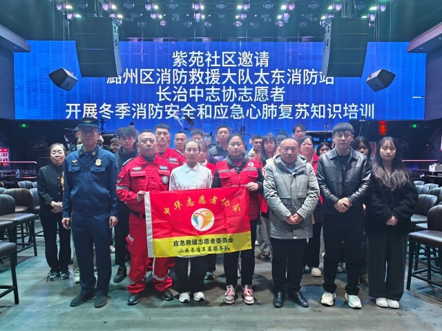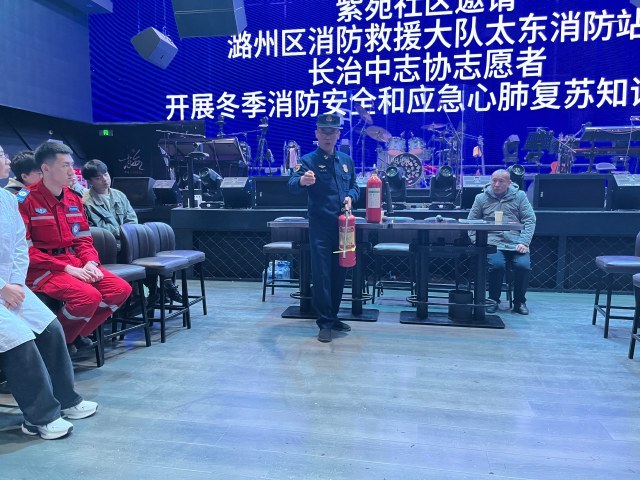 近日,紫苑社区邀请潞州区消防应急救援大队、太东消防应急救援站,联系中志协志愿者深入辖区重点营业娱乐场所开展“冬季”消防安全知识和心肺复苏知识培训。随后太东消防站工作人员对重点娱乐场所突然发生火灾,如何疏散进行了讲解,并现场组织实操实训,参加此次演练的有大酒店院里重点KTV、台球厅、汤臣水裹、花海。