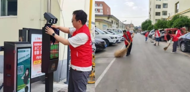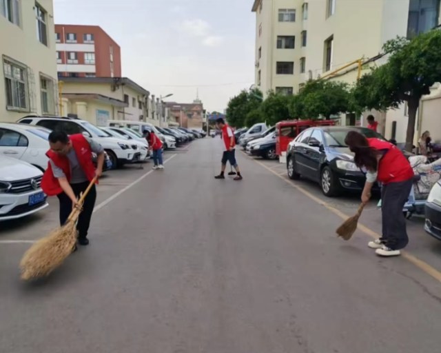 社区的工作人员、物业工作人员以及交通局的工作人员积极参与其中。大家身穿统一红色的志愿者服装,手持清扫工具,热情高涨地投入到各项任务中。