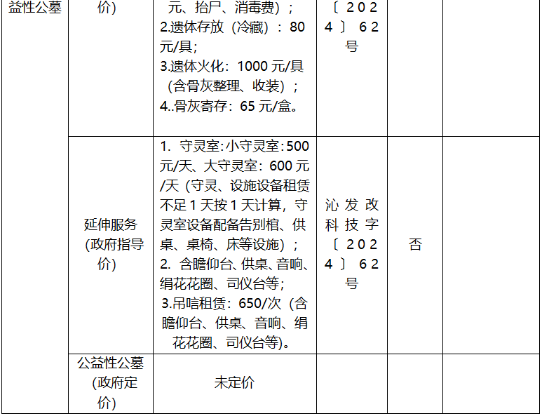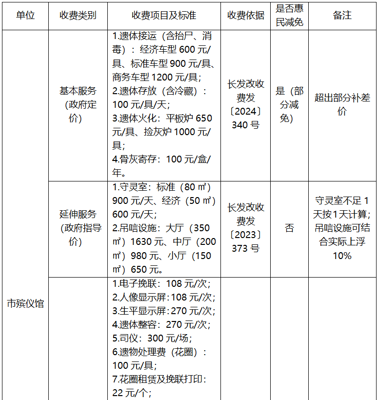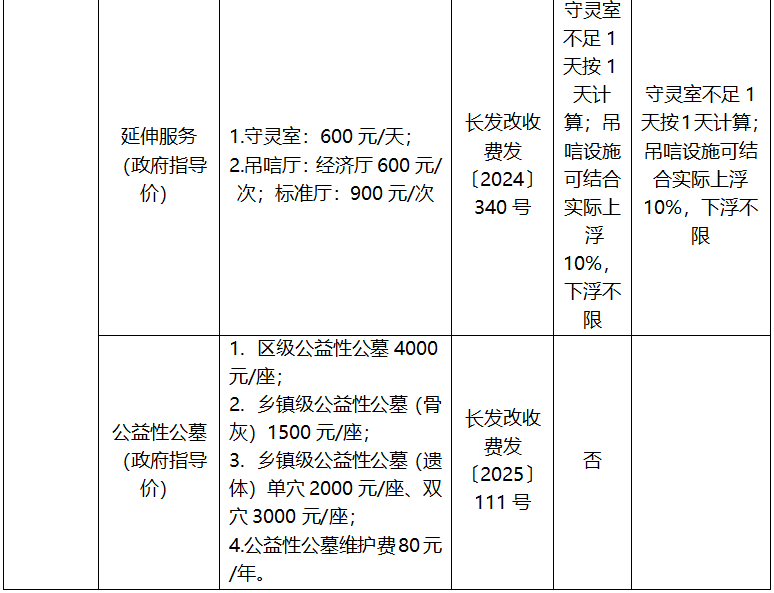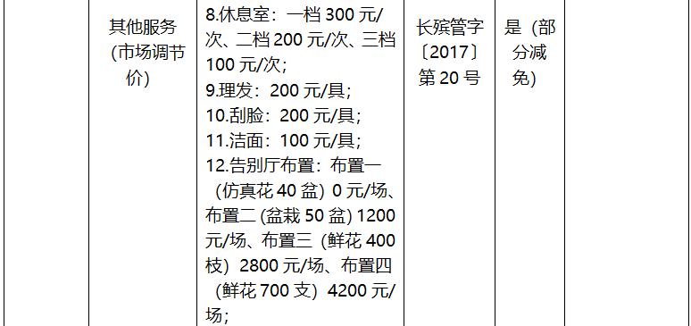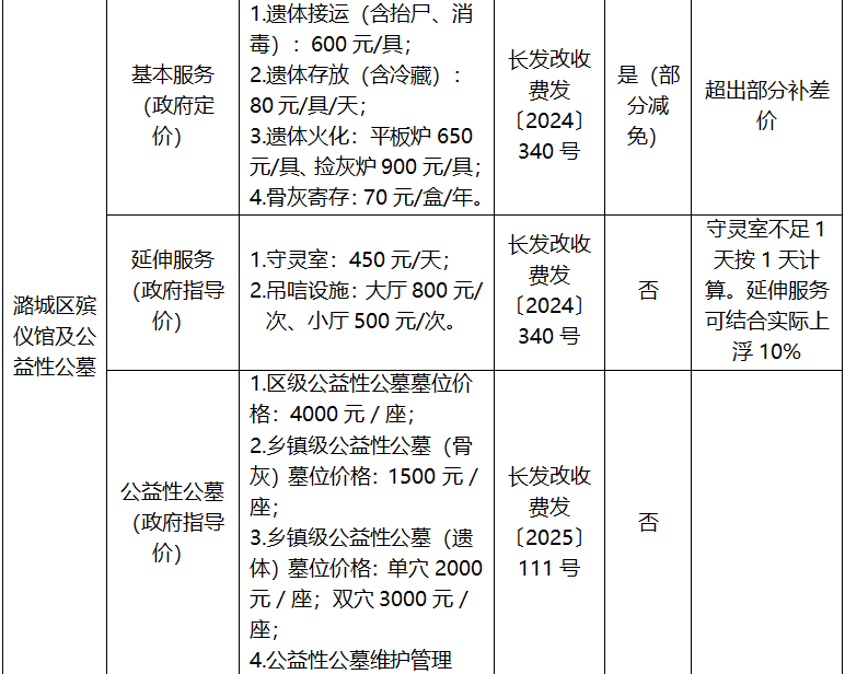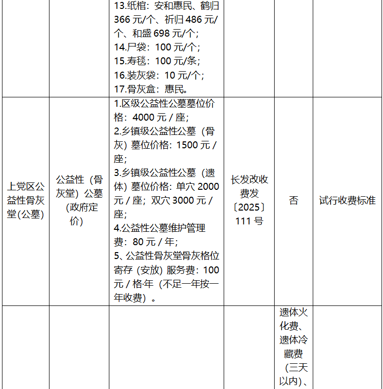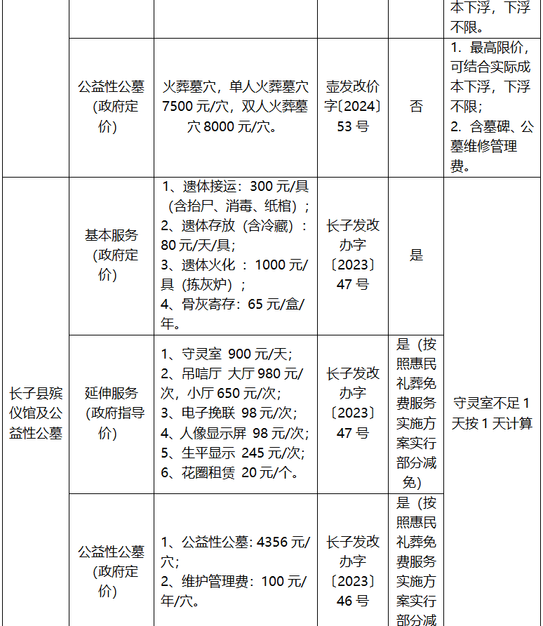 长治市殡葬服务项目收费标准公示表