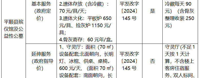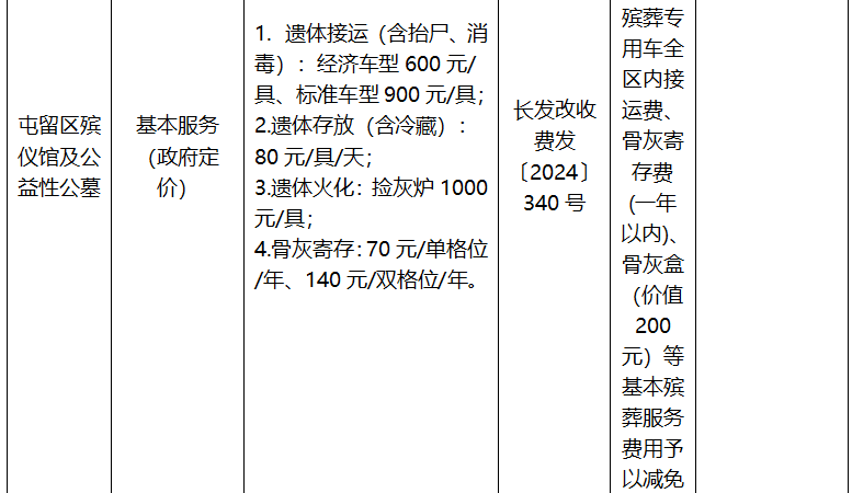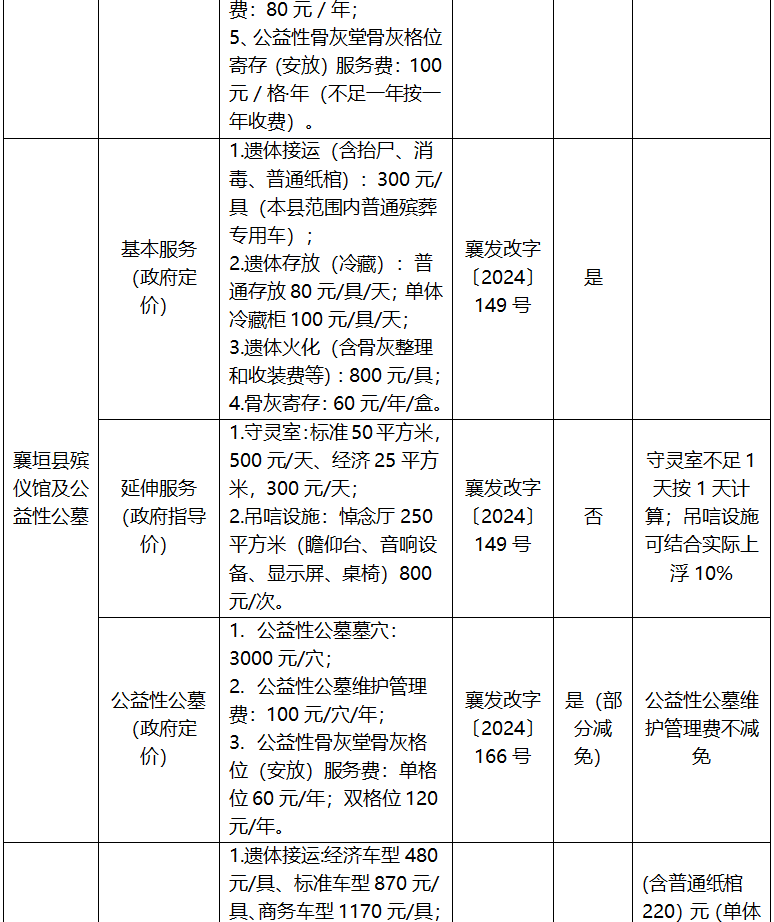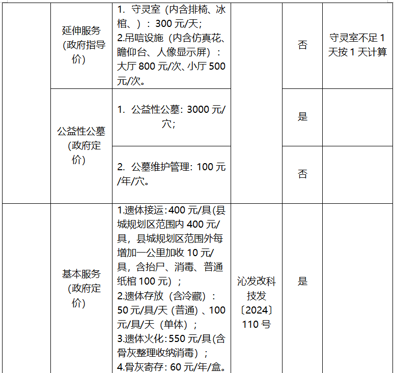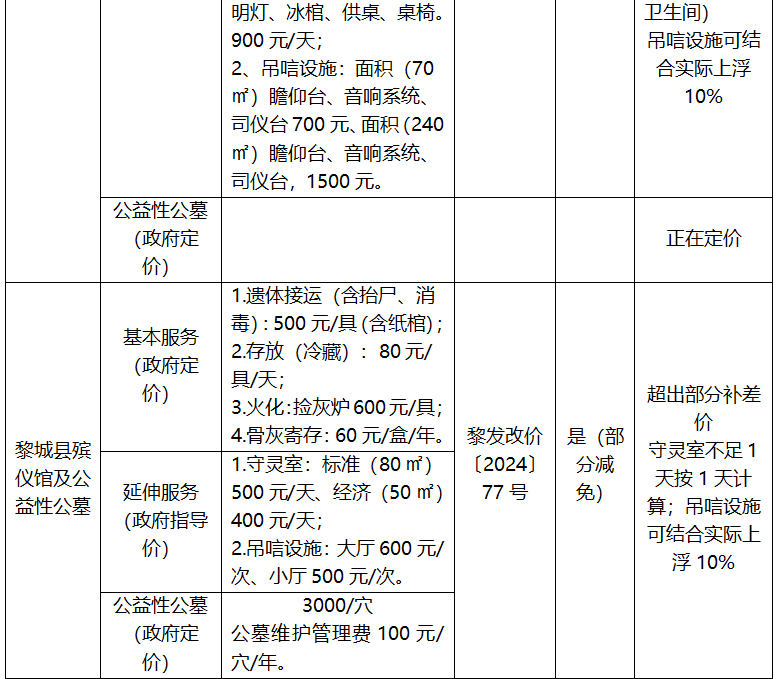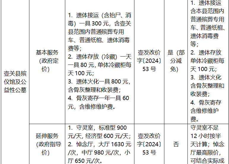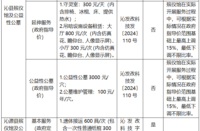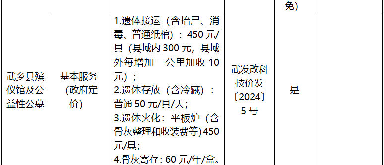 长治市殡葬服务项目收费标准公示表