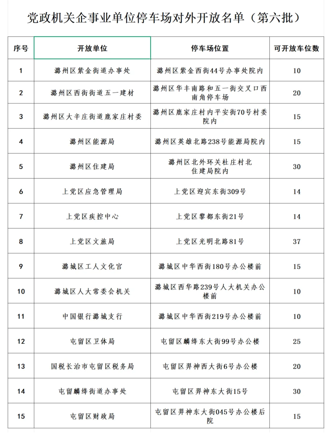 为深入推进文明出行专项行动,充分挖掘既有停车资源,有效缓解市民群众停车难问题,实现错时停车、资源共享,切实提升市民群众获得感幸福感,现面向社会免费开放第六批15家单位内部停车场错时停放车位(名单附后)。现将有关事宜公告如下: