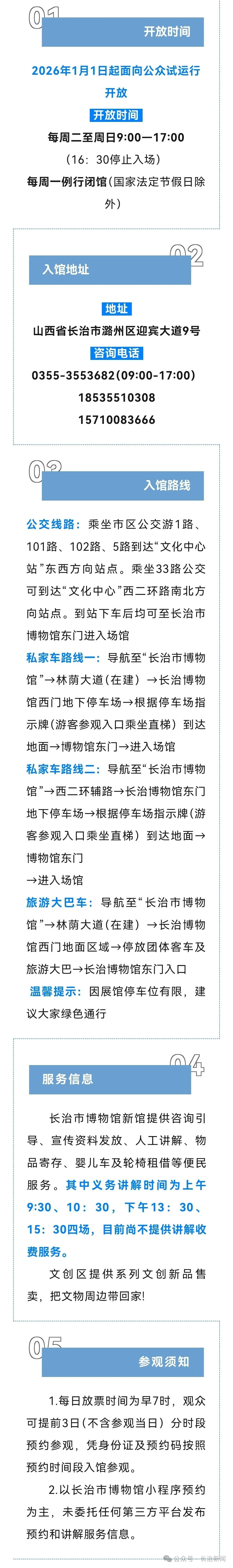 2026年1月1日,备受瞩目的长治市博物馆新馆将面向公众试运行开放。试运行期间因进行观众压力容量测试需要,每日将实行:分时段限流实名制预约,每日共分为四个时段,每个时段限流人数为1000人,共4000人。具体预约通道请您及时关注“长治博物馆”微信公众号更新发布。